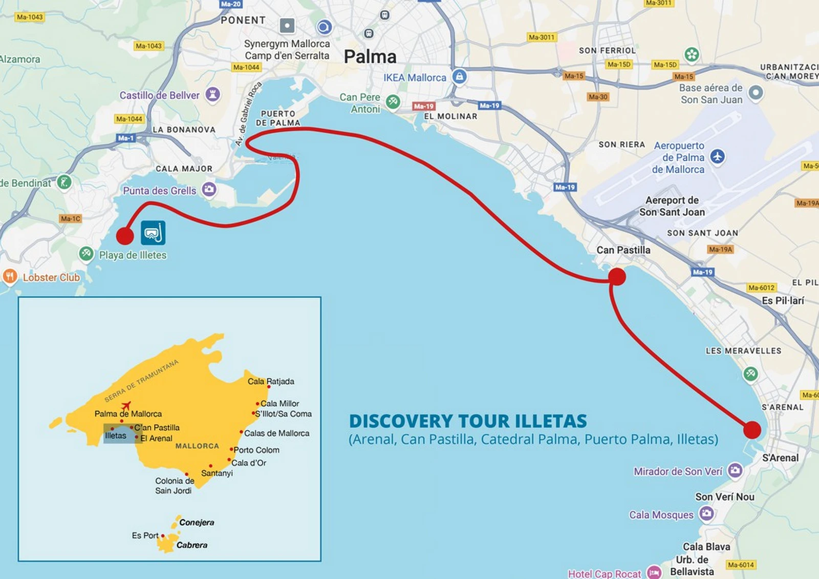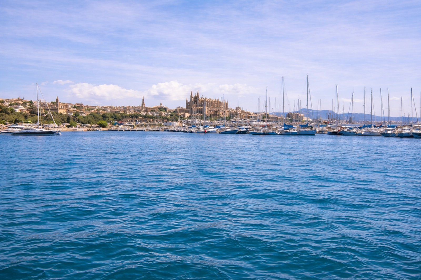 Discover Palma Bay and Illetas: This is the ideal tour if you enjoy combining culture, iconic landscapes, and dreamy coves for swimming. From the sea, you'll have the opportunity to admire Palma Cathedral, the Royal Palace of La Almudaina, Marivent Palace, the Port of Palma, Bellver Castle, and San Carlos Castle, among other landmarks. You'll anchor near Cala Illetas and immerse yourself in the natural beauty of this Mediterranean paradise. This expedition is perfect for curious families looking to discover southern Mallorca from a cultural perspective without missing the chance to swim in turquoise waters. It promises an unforgettable trip full of excitement and discovery.