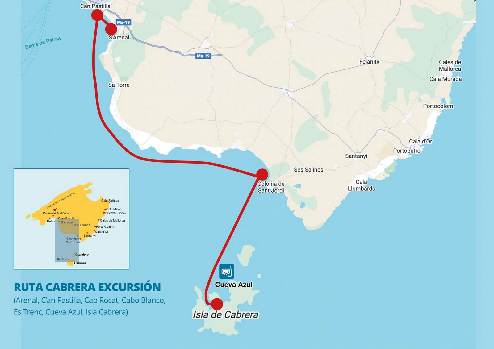 The excursion culminates with an unforgettable anchorage in the breathtaking Blue Cave of Cabrera, a perfect ending to a day filled with stunning landscapes, nature, and unforgettable moments.