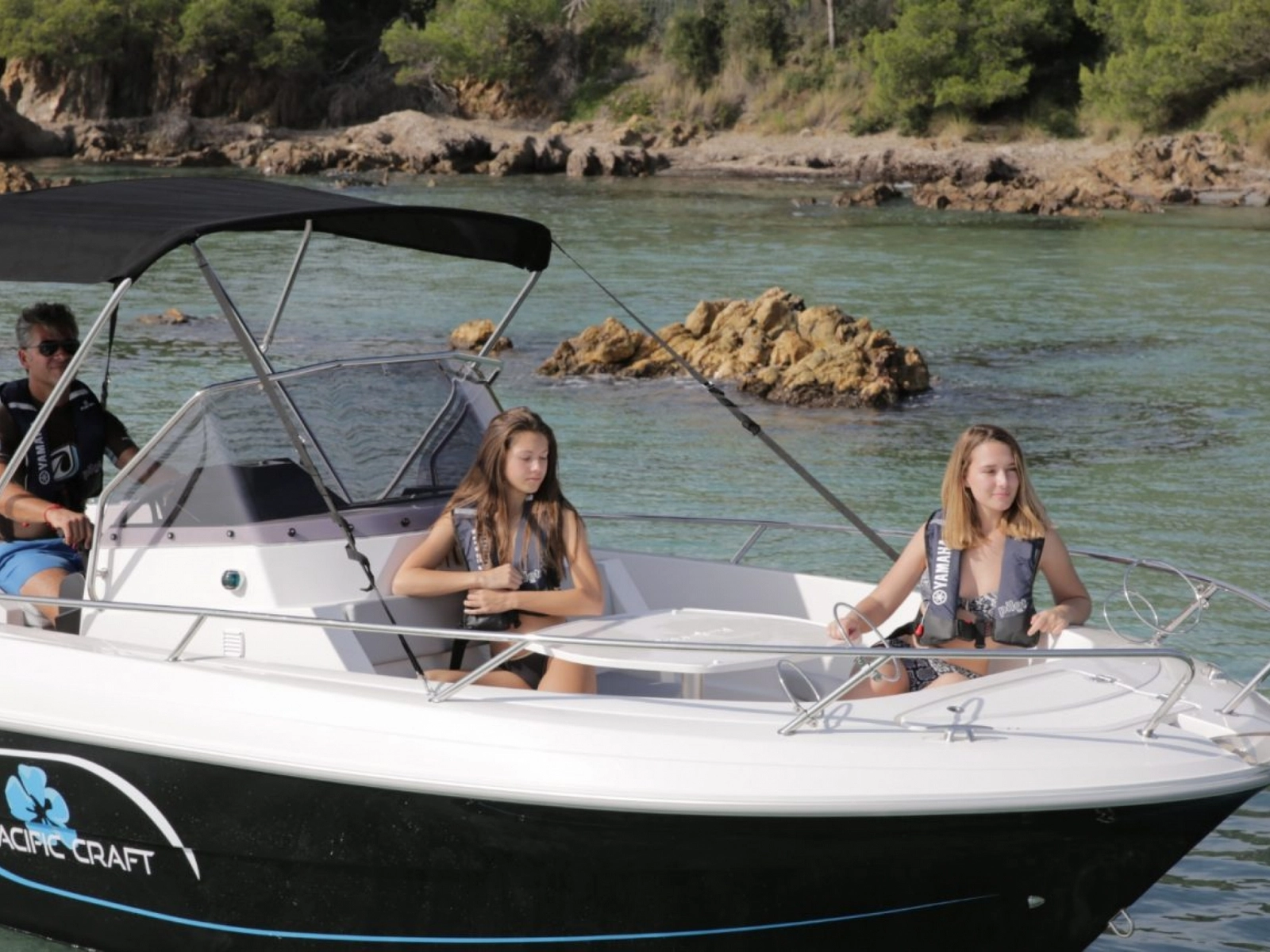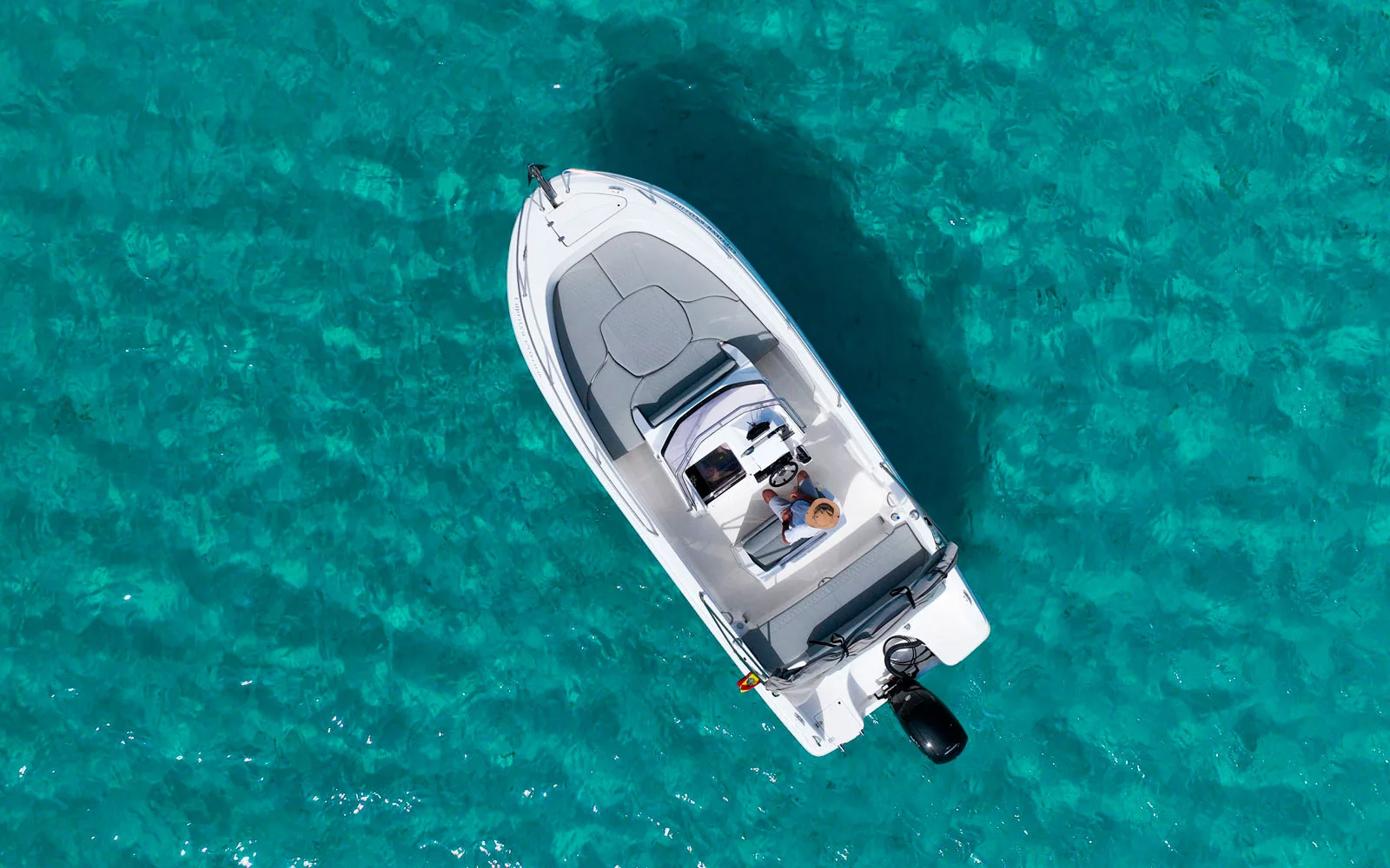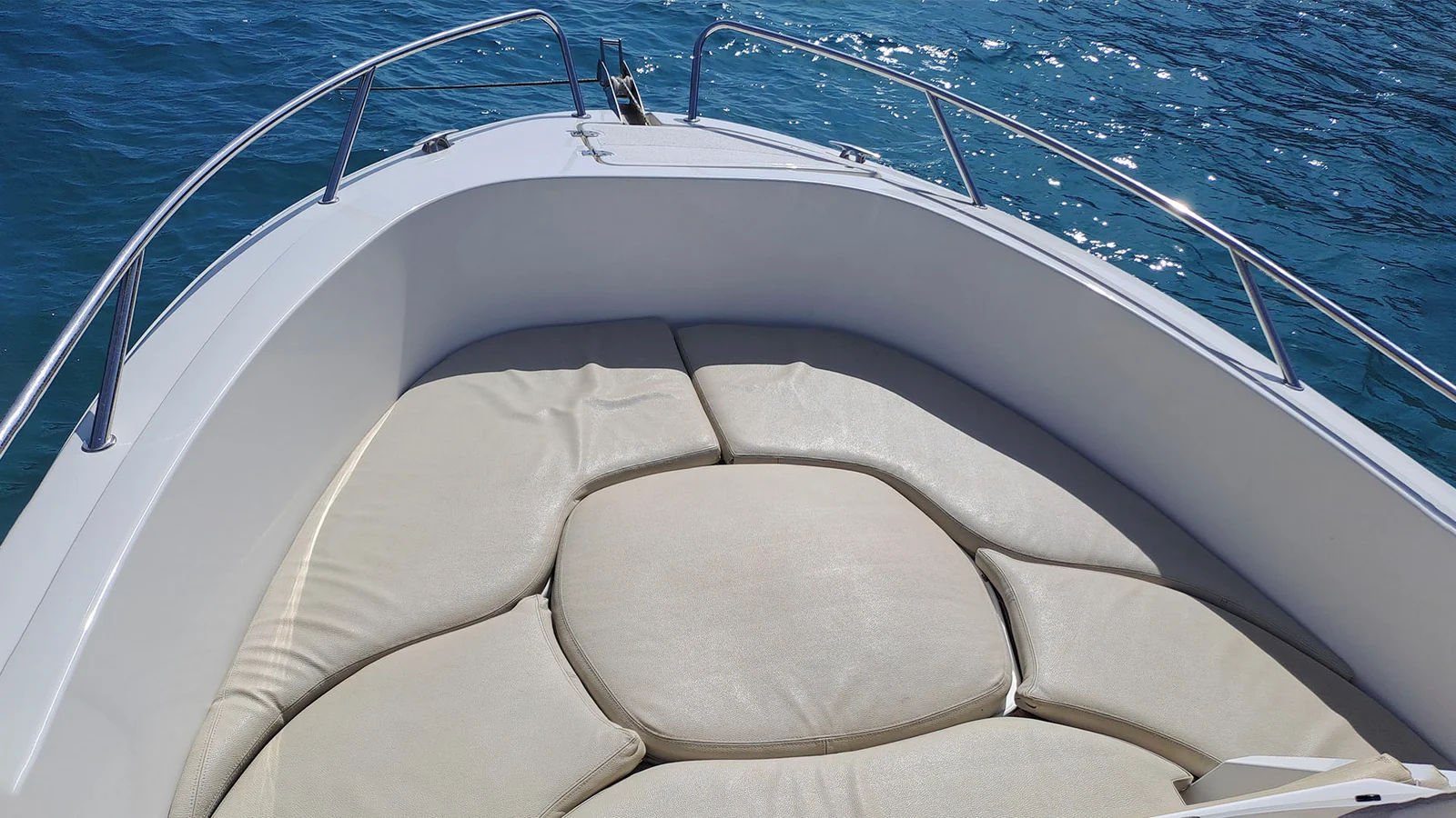 Certainly the most comprehensive model in its category, it features an big sunbathing area at the bow, a little cabin, large bathing platforms with a large ladder and deck shower, as well as a bimini top to protect from the sun, an anchor with electric windlass, a radio/bluetooth, and of course all safety equipment (life jackets, horn...).