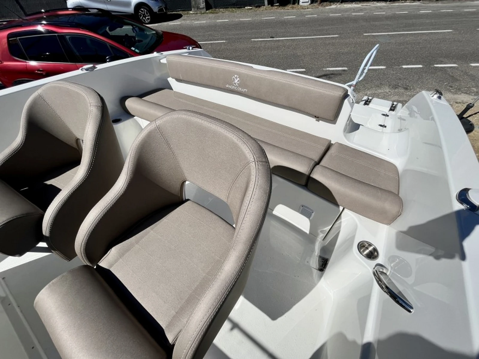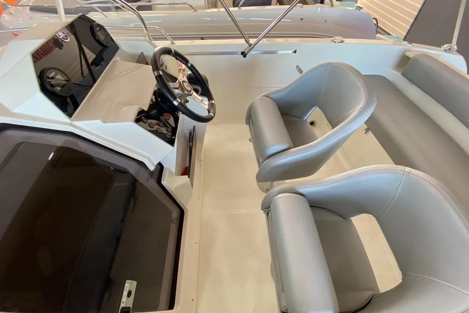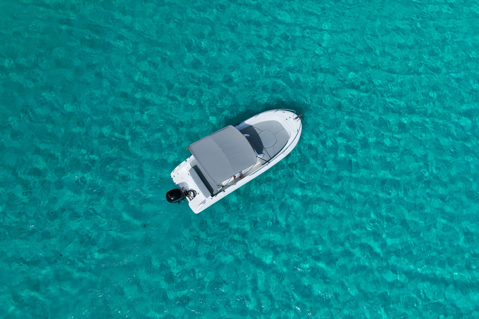 Certainly the most comprehensive model in its category, it features an big sunbathing area at the bow, a little cabin, large bathing platforms with a large ladder and deck shower, as well as a bimini top to protect from the sun, an anchor with electric windlass, a radio/bluetooth, and of course all safety equipment (life jackets, horn...).